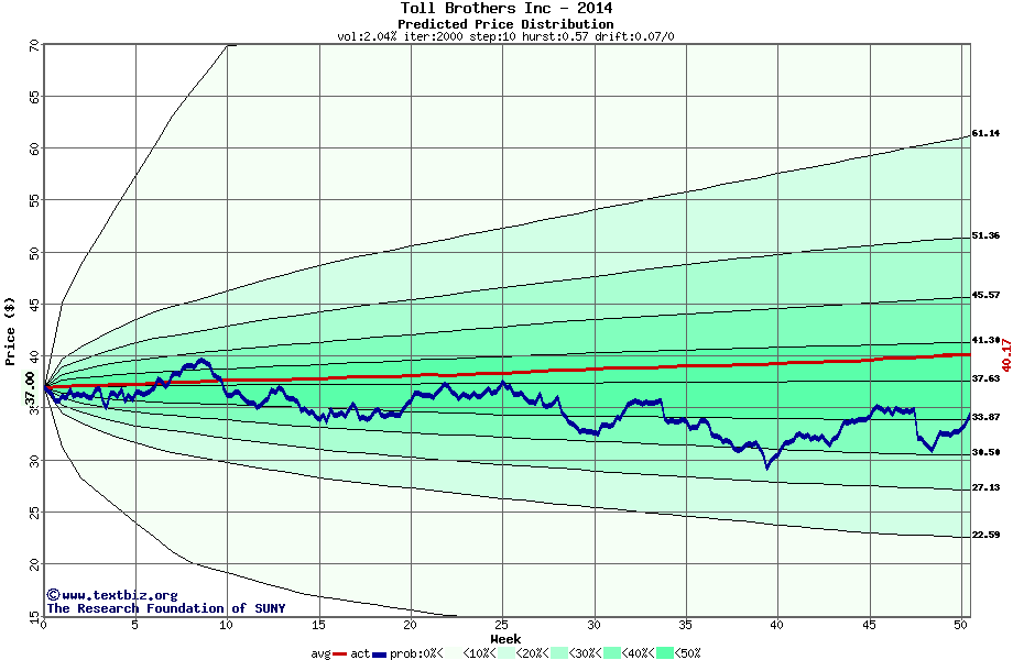 The following graph plots the year-to-date performance of the stock for 2014 compared to the probability calculated by a random walk model.