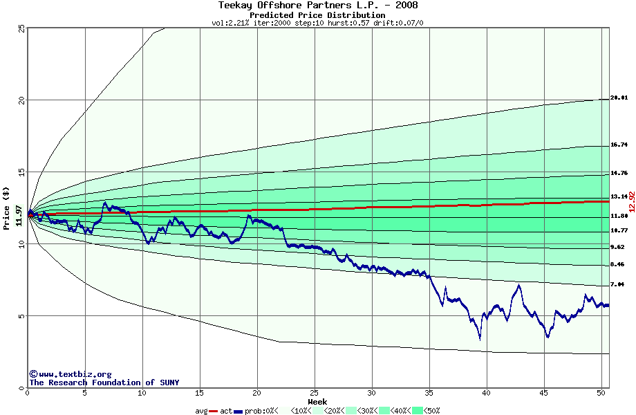 The following graph plots the year-to-date performance of the stock for 2008 compared to the probability calculated by a random walk model.