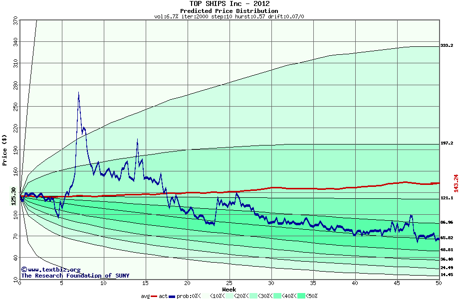 The following graph plots the year-to-date performance of the stock for 2012 compared to the probability calculated by a random walk model.