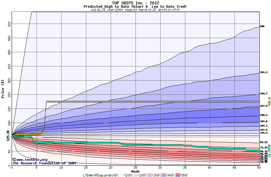 The high to date and low to date prices of the stock plotted against a random walk model for 2012 (what's this?).