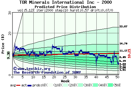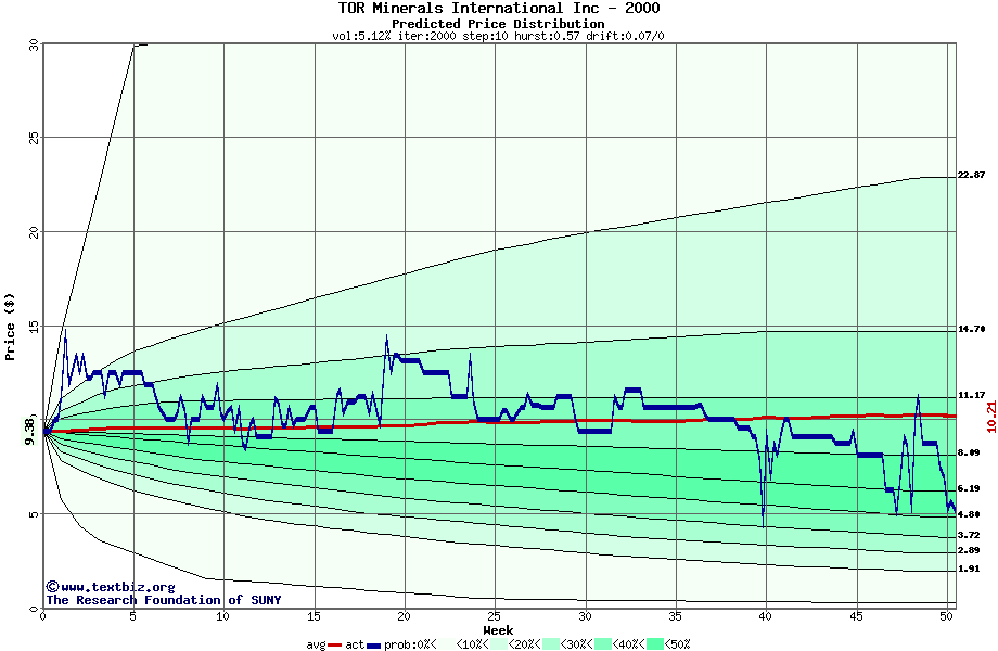 The high to date and low to date prices of the stock plotted against a random walk model for 2000 (what's this?).