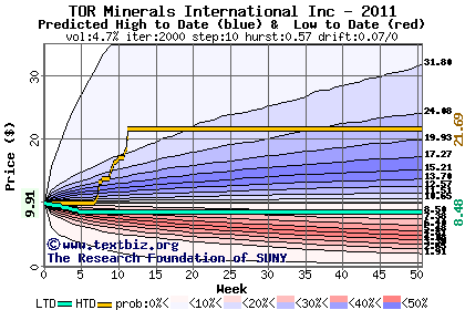 The high to date and low to date prices of the stock plotted against a random walk model for 2011 (what's this?).