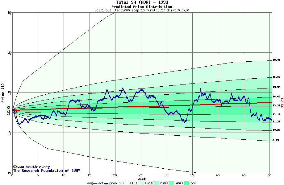 The following graph plots the year-to-date performance of the stock for 1998 compared to the probability calculated by a random walk model.