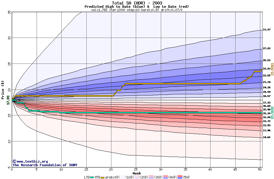 The high to date and low to date prices of the stock plotted against a random walk model for 2003 (what's this?).