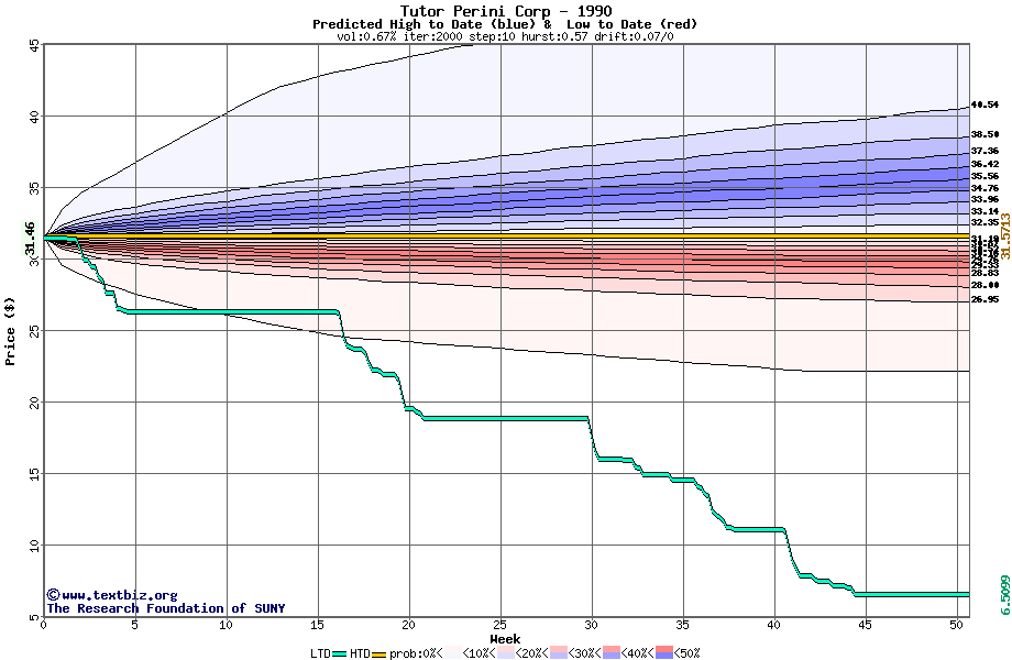 The high to date and low to date prices of the stock plotted against a random walk model for 1990 (what's this?).