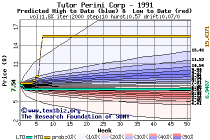 The high to date and low to date prices of the stock plotted against a random walk model for 1991 (what's this?).