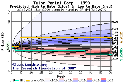 The high to date and low to date prices of the stock plotted against a random walk model for 1999 (what's this?).