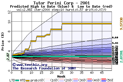 The high to date and low to date prices of the stock plotted against a random walk model for 2001 (what's this?).