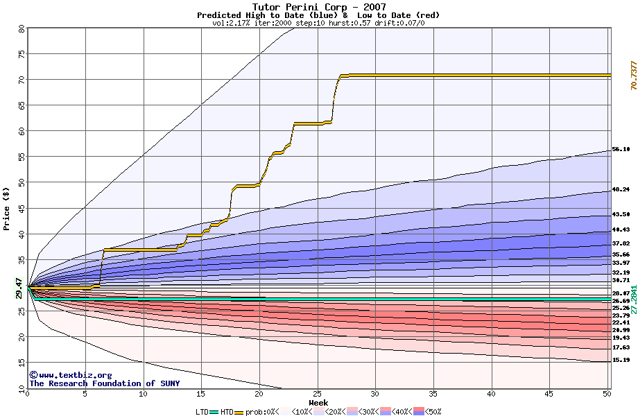 The high to date and low to date prices of the stock plotted against a random walk model for 2007 (what's this?).