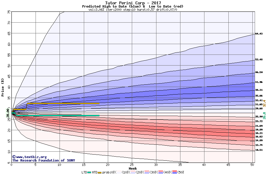 The high to date and low to date prices of the stock plotted against a random walk model for 2017 (what's this?).