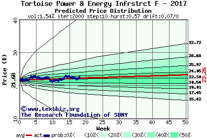 The high to date and low to date prices of the stock plotted against a random walk model for 2017 (what's this?).