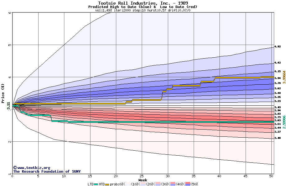 The high to date and low to date prices of the stock plotted against a random walk model for 1989 (what's this?).
