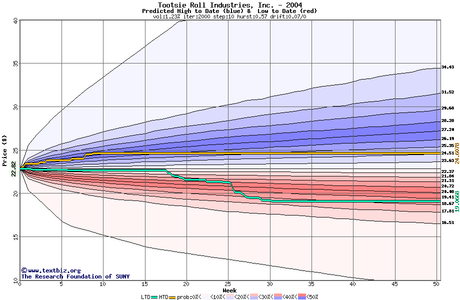 The high to date and low to date prices of the stock plotted against a random walk model for 2004 (what's this?).