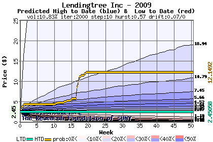The high to date and low to date prices of the stock plotted against a random walk model for 2009 (what's this?).