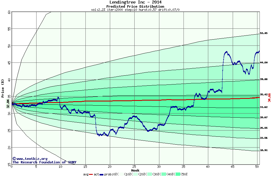 The following graph plots the year-to-date performance of the stock for 2014 compared to the probability calculated by a random walk model.