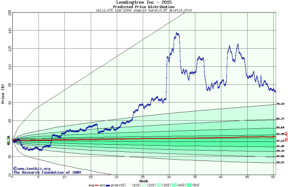 The following graph plots the year-to-date performance of the stock for 2015 compared to the probability calculated by a random walk model.