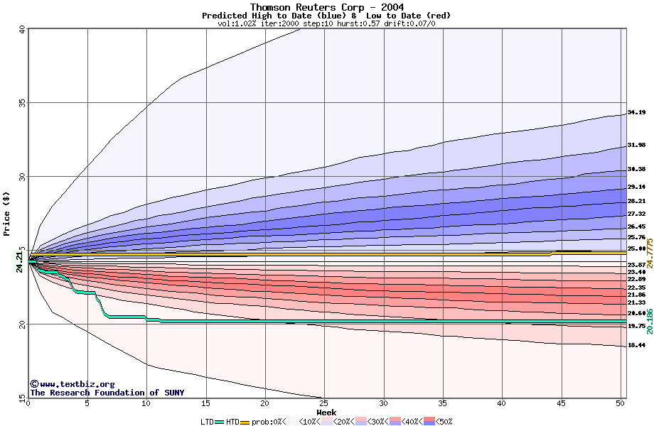 The high to date and low to date prices of the stock plotted against a random walk model for 2004 (what's this?).