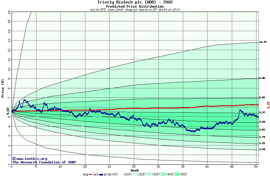 The following graph plots the year-to-date performance of the stock for 2002 compared to the probability calculated by a random walk model.