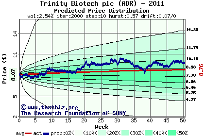 The high to date and low to date prices of the stock plotted against a random walk model for 2011 (what's this?).