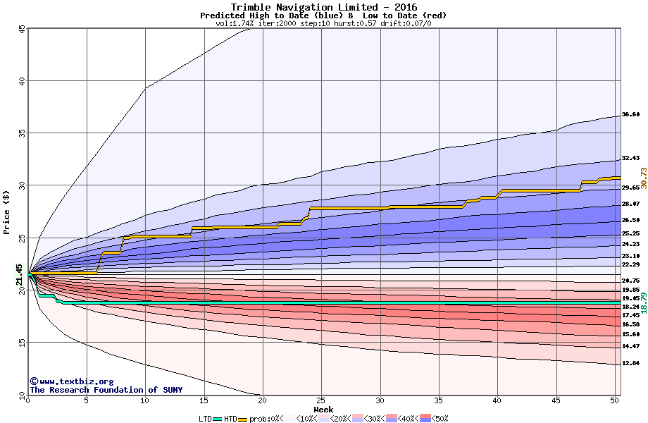 The high to date and low to date prices of the stock plotted against a random walk model for 2016 (what's this?).