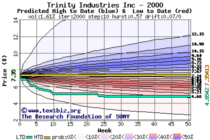 The high to date and low to date prices of the stock plotted against a random walk model for 2000 (what's this?).