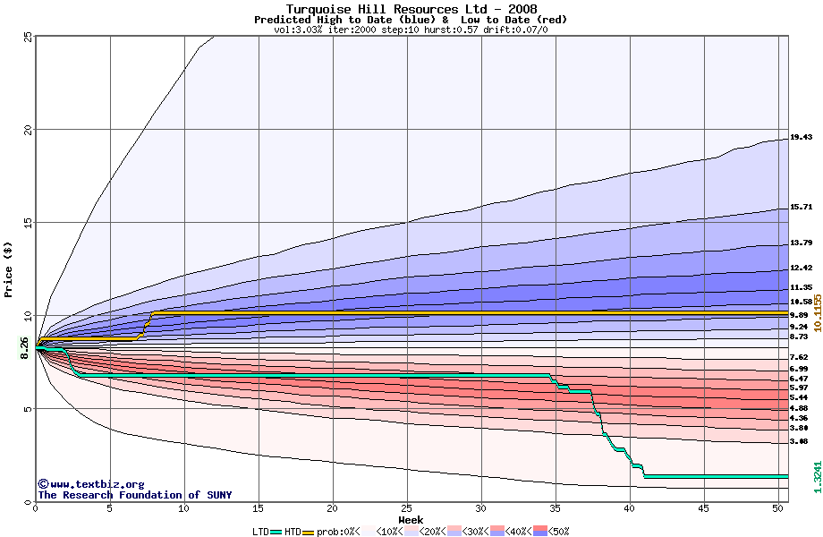 The high to date and low to date prices of the stock plotted against a random walk model for 2008 (what's this?).