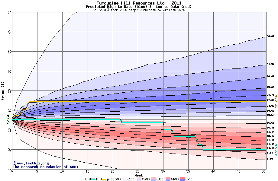 The high to date and low to date prices of the stock plotted against a random walk model for 2011 (what's this?).