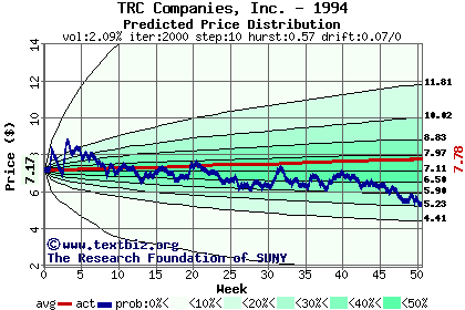 The high to date and low to date prices of the stock plotted against a random walk model for 1994 (what's this?).