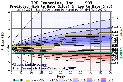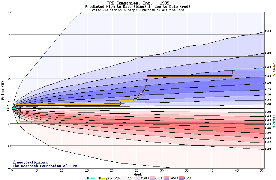 The high to date and low to date prices of the stock plotted against a random walk model for 1999 (what's this?).