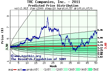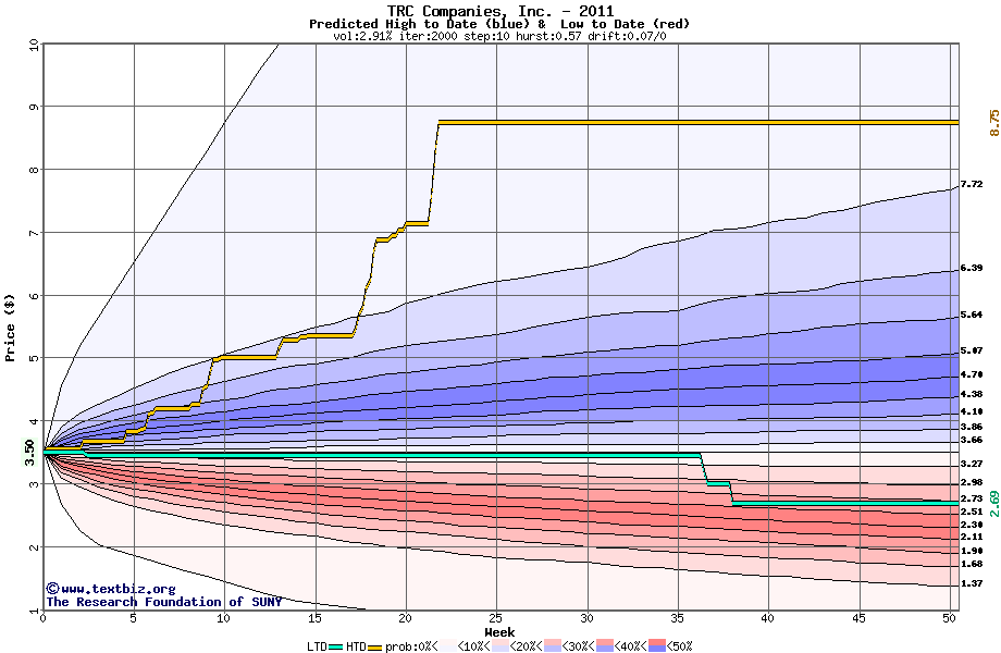 The high to date and low to date prices of the stock plotted against a random walk model for 2011 (what's this?).