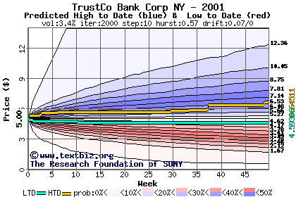 The high to date and low to date prices of the stock plotted against a random walk model for 2001 (what's this?).