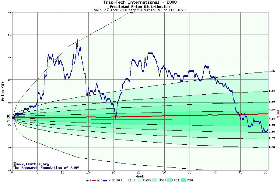The following graph plots the year-to-date performance of the stock for 2000 compared to the probability calculated by a random walk model.