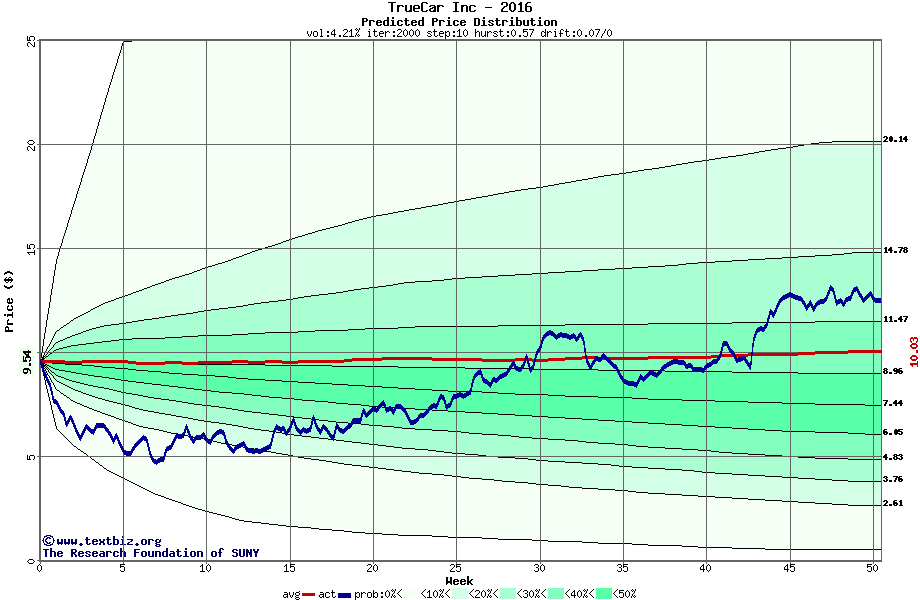 The following graph plots the year-to-date performance of the stock for 2016 compared to the probability calculated by a random walk model.