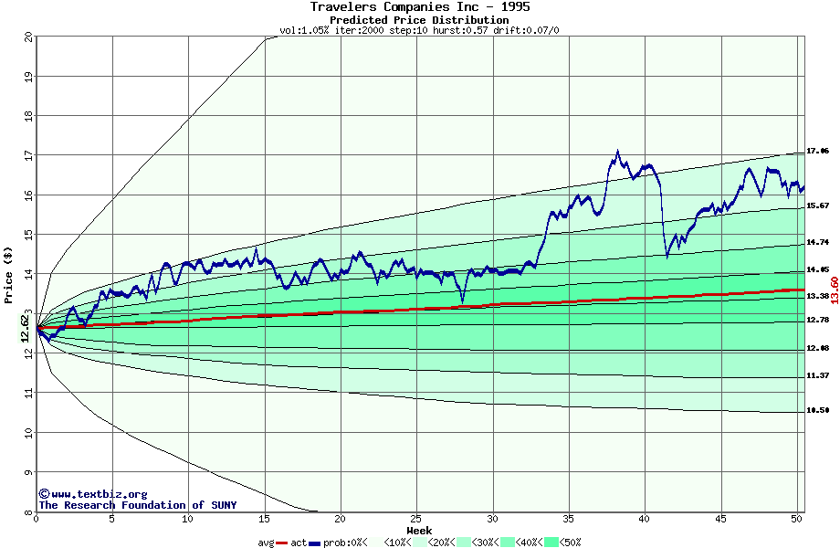 The following graph plots the year-to-date performance of the stock for 1995 compared to the probability calculated by a random walk model.