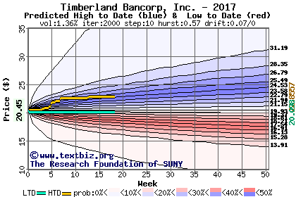 The high to date and low to date prices of the stock plotted against a random walk model for 2017 (what's this?).
