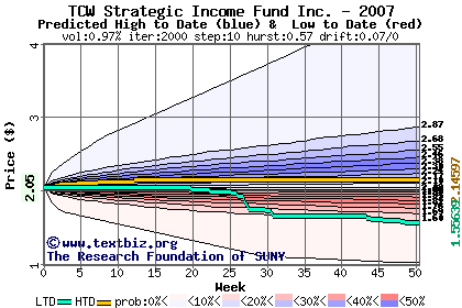 The high to date and low to date prices of the stock plotted against a random walk model for 2007 (what's this?).