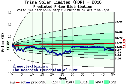 The high to date and low to date prices of the stock plotted against a random walk model for 2016 (what's this?).