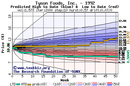 The high to date and low to date prices of the stock plotted against a random walk model for 1992 (what's this?).