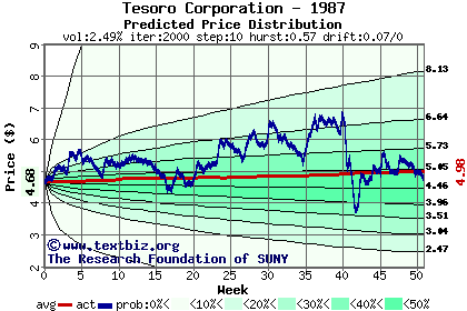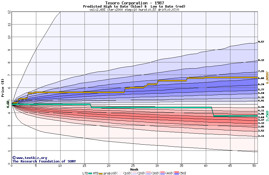 The high to date and low to date prices of the stock plotted against a random walk model for 1987 (what's this?).