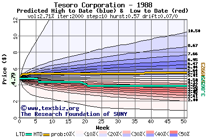 The high to date and low to date prices of the stock plotted against a random walk model for 1988 (what's this?).