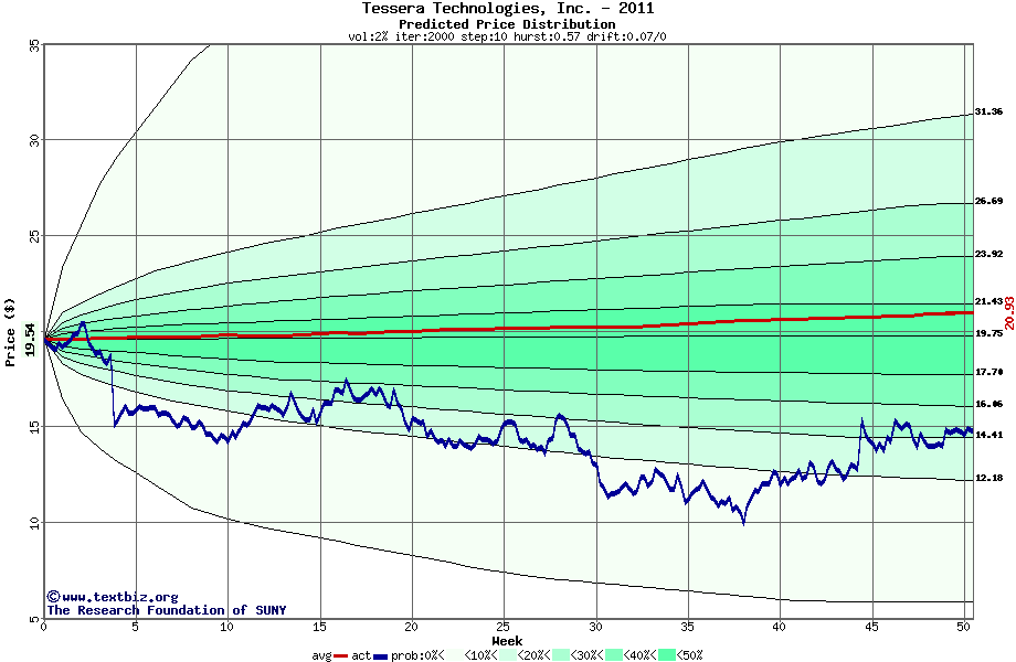 The following graph plots the year-to-date performance of the stock for 2011 compared to the probability calculated by a random walk model.