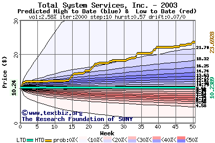 The high to date and low to date prices of the stock plotted against a random walk model for 2003 (what's this?).