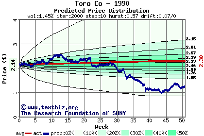 The following graph plots the year-to-date performance of the stock for 1990 compared to the probability calculated by a random walk model.