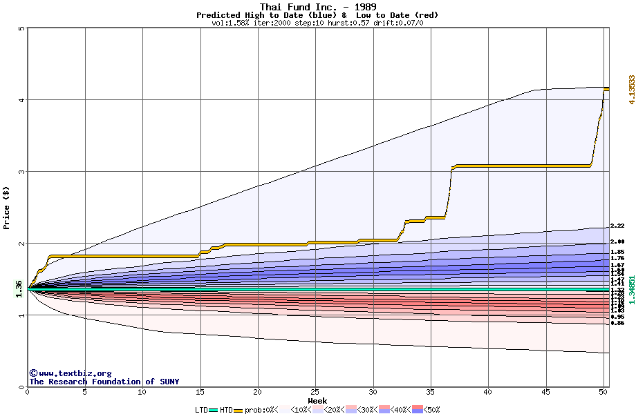 The following graph plots the year-to-date performance of the stock for 1989 compared to the probability calculated by a random walk model.