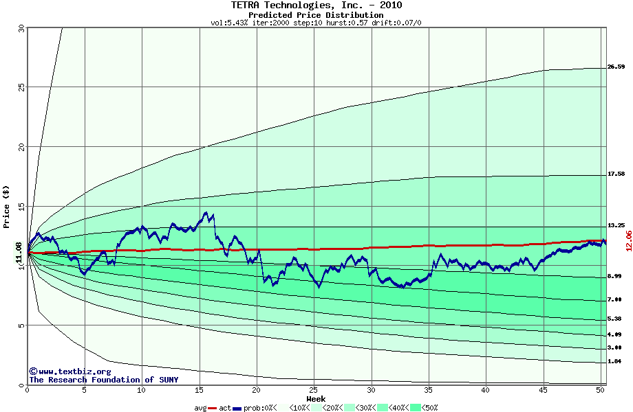 The following graph plots the year-to-date performance of the stock for 2010 compared to the probability calculated by a random walk model.