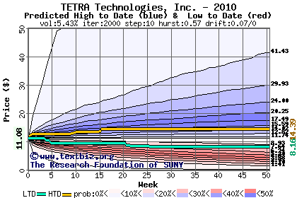 The high to date and low to date prices of the stock plotted against a random walk model for 2010 (what's this?).