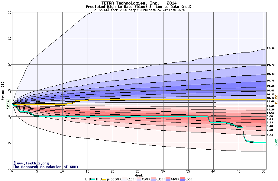 The high to date and low to date prices of the stock plotted against a random walk model for 2014 (what's this?).