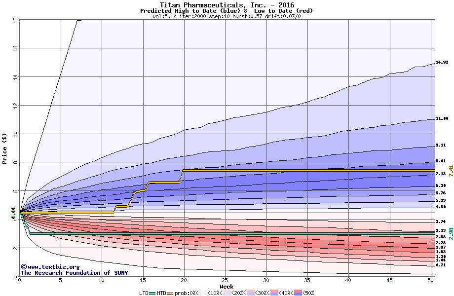 The high to date and low to date prices of the stock plotted against a random walk model for 2016 (what's this?).