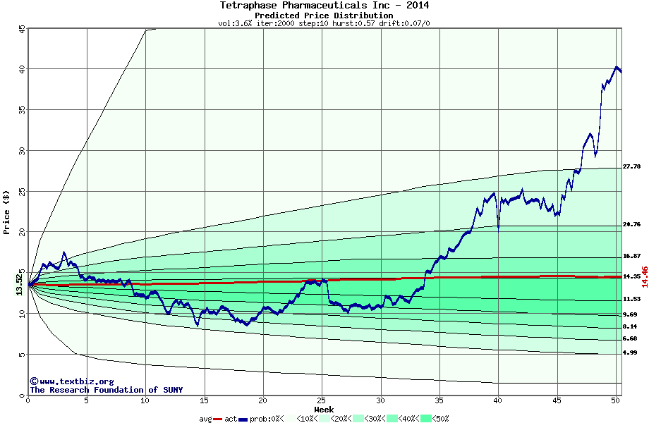 The following graph plots the year-to-date performance of the stock for 2014 compared to the probability calculated by a random walk model.