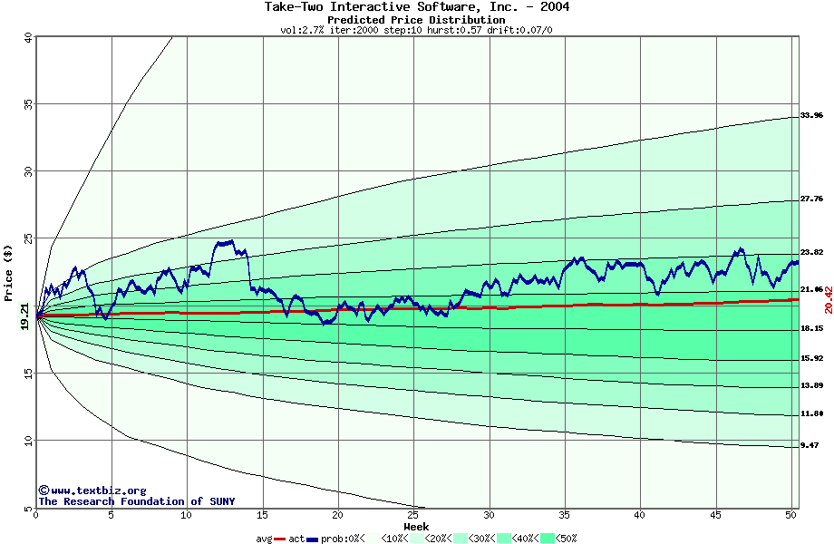 The following graph plots the year-to-date performance of the stock for 2004 compared to the probability calculated by a random walk model.